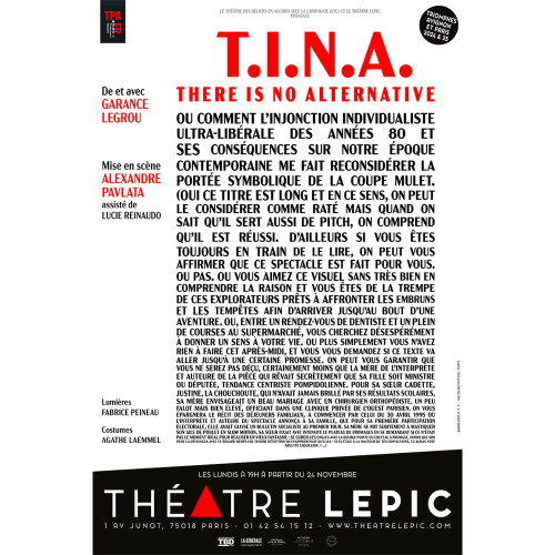 Dans un souci de communication efficace, il m’a été demandé de résumer mon spectacle. Mais j’en suis incapable. Je suis incapable d’être concise. Mes amis ne me demandent jamais « Comment ça va? ». Ils savent que je vais répondre. Vraiment. En détail. D’ailleurs, je n’ai plus d’amis. Je laisse donc à des personnes de qualité (les personnes qui ont déjà vu ce spectacle) le soin de le « résumer » : « Une pépite rare, unique, originale, clownesque, pertinente, brillante, émouvante. T.I.N.A. n’est pas descriptible, mais – croyez-moi – irrésistible. » Marie « Un spectacle venu d’ailleurs, d’une finesse, d’une drôlerie et d’une intelligence inouïe » Benoit « Quelle performance inclassable ! On rit beaucoup, on réfléchit beaucoup, on est émus, secoués, attendris, séduits » Stephanie