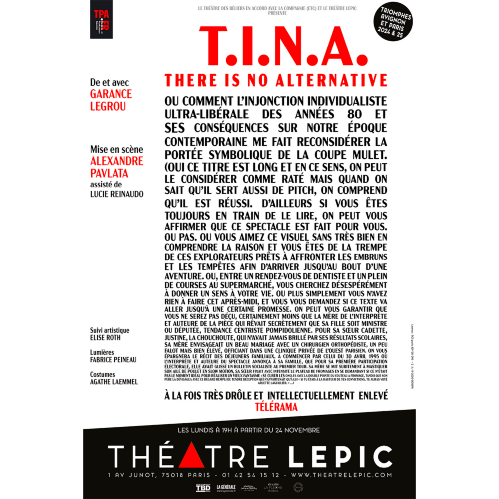 ♥♥♥♥ « T. I. N. A. (There is no alternative) est le titre de ce seul en scène inouï qui sort des sentiers battus. À la fois espiègle et singulier, percutant et généreux, hilarant et philosophique, engagé et intelligent, ce spectacle est vraiment inclassable. Mais surtout T.I.N.A. est immanquable. » COUP DE THÉÂTRE